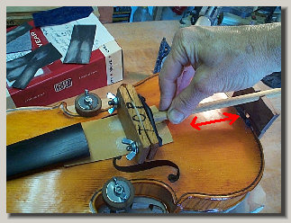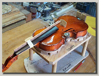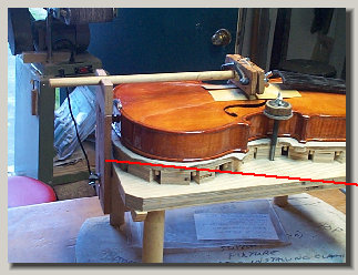 ...Here the violin body is clamped on the horizontal support and the bridge foot shaping tool is installed. ...It consists of a hardwood dowel which is firmly attached to a hardwood block at exactly a 90 degree angle. |