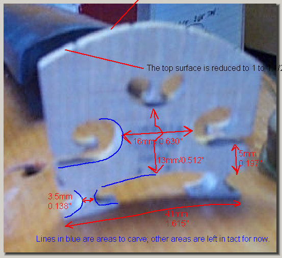 ...Lower the string grooves in the bridge (using a jewlers tapered round file) until the distance from the fingerboard to the strings are (for synthetic strings): String : *distance in inches: *distance in mm: G 0.197" 5 mm D 0.170" 4.3mm A 0.146" 3.7mm E 0.118" 3.0mm |