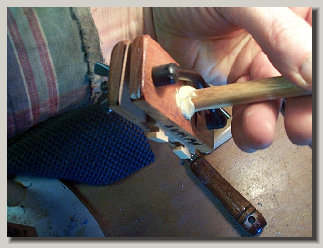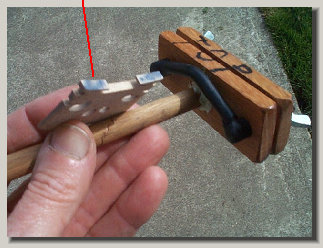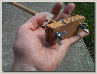 ...Through this block a 'U' shaped bolt with two wingnuts passes; this is the bridge clamp bolt. It is installed thorugh oversize holes so it can rotate slightly. ...Now because the bridge makes an eight degree angle, the inside surface of the front clamp board is sanded to this same eight degree angle, so when the bridge is sandwiched between the two hardwood blocks, the outside face is parallel with the back of the block with the hardwood dowell attached. |