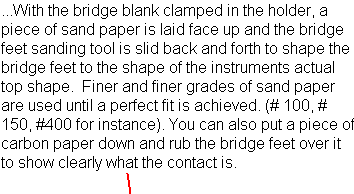| ...When the feet are the correct thickness and the bridge will stand 'on its own two feet' with the back perpendicular to the top plate, then the feet shaping is done. This will insure good sound transmission to the top plate. | ||||||||||||||||||||||||||||||||||||||||||||||